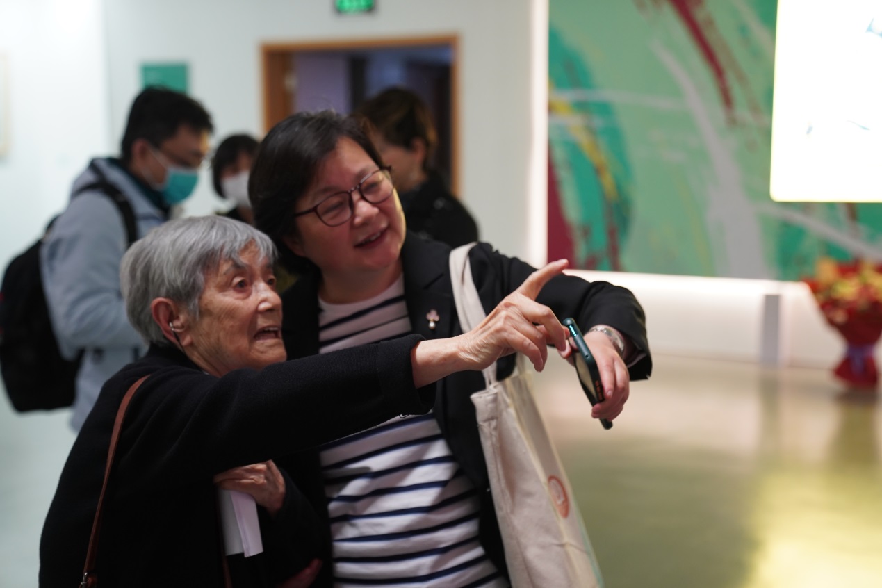 中國老舍研究會原會長、老舍研究專家關(guān)紀(jì)新坐在輪椅上細(xì)賞每幅畫作