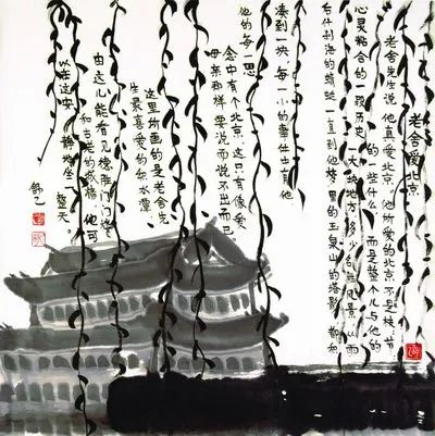 《老舍愛北京》,舒乙繪,82cm×82cm。這幅畫的題記中,舒乙先生寫下父親老舍的北京情緣:“老舍先生說,他真愛北京,他所愛的北京不是枝枝節(jié)節(jié)的一些什么,而是整個兒與他的心靈粘合的一段歷史,一大塊地方,多少名勝風(fēng)景,從雨后什剎海的蜻蜓一直到他夢里的玉泉山的塔影,都積湊到一塊,每一小的事件中有他,而他的每一思念中有個北京,這只有像愛母親那樣要說而說不出而已。這里所畫的是老舍先生最喜愛的積水潭,由這兒能看見德勝門門樓和古老的城墻,他可以在這安靜地坐一整天。”