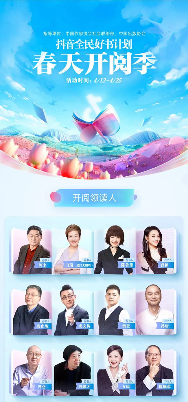 與抖音發(fā)起“抖音全民好書計劃·春天開閱季”系列活動,聯合多家媒體機構、出版機構,通過系列直播、短視頻等形式,鼓勵群眾分享新書好書,倡導全民閱讀,自4月12日活動啟動以來,目前全網觀看量達2.6億。