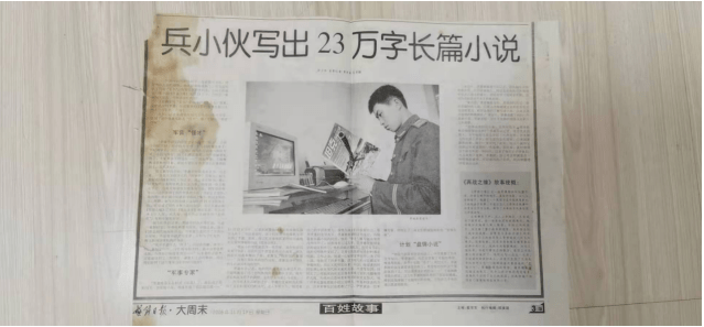 銀月光華:第一本小說初稿完成之后,一直想拿出去試試自己什么水平。當(dāng)時(shí)我用電腦單機(jī)操作,用3.5寸軟盤刻錄好內(nèi)容,郵寄給朋友發(fā)表,當(dāng)時(shí)就被鐵血的編輯看中,正式簽約,這是意外之喜。那時(shí)候沒有因?yàn)檫@本小說賺到錢,但卻是一種重要的肯定。小說完結(jié)后受到了當(dāng)?shù)厝請(qǐng)?bào)的關(guān)注,某一個(gè)下午記者來部隊(duì)采訪,當(dāng)時(shí)部隊(duì)干部也很高興,認(rèn)為我是給部隊(duì)爭(zhēng)光了,報(bào)道發(fā)表后我沒想到篇幅居然很大,大概有半開報(bào)紙的四分之一版面,照片還很清晰。我最親愛的姥姥還把報(bào)道壓在茶幾下,逢人來便能看到,姥姥去世后,我把那份報(bào)道留到現(xiàn)在。