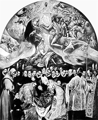 在西班牙小城托萊多,有一個中世紀(jì)教堂,名叫圣托梅,無數(shù)游客去那里瞻仰格列柯的畫作《奧爾加斯伯爵的葬禮》。這幅畫描繪了兩位圣徒安葬奧爾加斯伯爵的一幕。畫面上部天堂,下部塵世。遺體降下地面,靈魂飛升天堂。奧爾加斯伯爵是一位西班牙貴族,1323年埋葬在圣托梅教堂,在1580年代,教區(qū)牧師委托畫家格列柯來描繪伯爵的葬禮和圍繞它而產(chǎn)生的傳說。據(jù)說奧爾加斯伯爵下葬時,圣奧古斯丁和圣斯蒂芬從天上出現(xiàn),幫助吊唁者埋葬他。