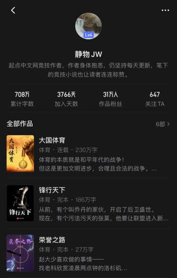 2012年,一直閱讀網(wǎng)絡(luò)小說的靜物,想賺點稿費養(yǎng)活自己,為家里減輕點負擔,開始摸索著在起點中文網(wǎng)創(chuàng)作體育競技小說。