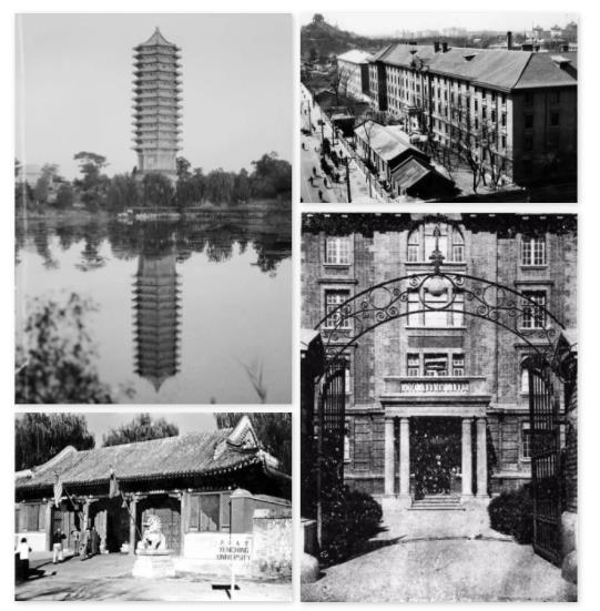 左側(cè)兩幅:舊時(shí)的燕京大學(xué);右側(cè)兩幅:北京大學(xué)沙灘紅樓舊址
