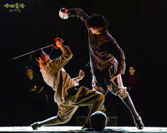 全戲最能凸顯藏族氣質(zhì)的場(chǎng)景當(dāng)屬雷歐提斯與哈姆雷特最后的決斗。二人劍拔弩張,藏族青年演員的民族血?dú)庠诖丝贪l(fā)揮得淋漓盡致。從激烈打斗到最后一一倒下,每個(gè)動(dòng)作、每場(chǎng)交鋒都極具力量感與爆發(fā)力,緊緊牽動(dòng)著觀眾的心。最后二人紛紛倒下,在死亡即將來臨的時(shí)刻,他們抬起頭,向上天言說著,他們仿佛看到了頭頂盤旋的禿鷲,兩位英勇青年的死亡有種莫名的蒼涼感。除了決斗橋段外,哈姆雷特的獨(dú)白也被藏族演員扎西邊巴羅布(普通話版)和頓珠次仁(藏語版)演繹得十分出彩。藏族演員在表演“生存還是毀滅”的大段獨(dú)白之時(shí),每一個(gè)肢體動(dòng)作都傳遞著哈姆雷特的掙扎與無力。身體與言語的共振式闡釋讓原本枯燥的大段獨(dú)白深入人心,觀眾們仿佛能與哈姆雷特此刻的猶豫與痛苦共情。盡管兩位藏族演員的普通話還不夠標(biāo)準(zhǔn),臺(tái)詞說起來過快,但他們?cè)谖枧_(tái)上奪人眼球的肢體表達(dá)足以彌補(bǔ)這一瑕疵。
