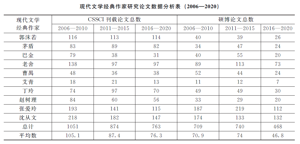 文學(xué)經(jīng)典是一個詩性的敞開空間,在生產(chǎn)與接受過程中,打上了不同時代的思想文化烙印。近百年中國新文學(xué)經(jīng)典的生成與中國社會急劇變革的歷史語境密切關(guān)聯(lián)?;仡櫺轮袊?0多年現(xiàn)代文學(xué)經(jīng)典傳播接受的歷史,大致上經(jīng)歷了三個時期:20世紀(jì)50—70年代,以政治視角為主導(dǎo)闡釋經(jīng)典的30年;80—90年代,以文化視角為主要視角解讀經(jīng)典的新時期20年;2000年后,以多元話語解讀經(jīng)典的新世紀(jì)20年。整體上呈現(xiàn)為由“共名”走向“無名”的學(xué)術(shù)面向。近20年,中國現(xiàn)代文學(xué)經(jīng)典研究與市場經(jīng)濟(jì)轉(zhuǎn)型相逢,與新時期大眾文化思潮相遇,受碎片化信息傳播影響,現(xiàn)代文學(xué)經(jīng)典研究(除少數(shù)或個別經(jīng)典作家外)整體上呈現(xiàn)弱化趨勢。根據(jù)知網(wǎng)數(shù)據(jù),我們分三個五年時間段,統(tǒng)計(jì)分析了近15年(2006—2020)CSSCI來源期刊發(fā)表的研究現(xiàn)代文學(xué)經(jīng)典作家(被中國現(xiàn)代文學(xué)史列專門章節(jié)討論的重點(diǎn)作家,除魯迅外)的論文與研究現(xiàn)代經(jīng)典作家的碩博論文(見下表)。經(jīng)過比較,近5年經(jīng)典作家研究的CSSCI論文與碩博論文數(shù)量均呈現(xiàn)明顯下降趨勢。隨著高等院校碩士博士生招收數(shù)量的增加、中文專業(yè)現(xiàn)代文學(xué)研究教學(xué)從業(yè)人員的增加,現(xiàn)代文學(xué)領(lǐng)域?qū)W術(shù)成果數(shù)量整體上呈上升趨勢,但經(jīng)典作家研究論文則在減少,比例明顯下降。