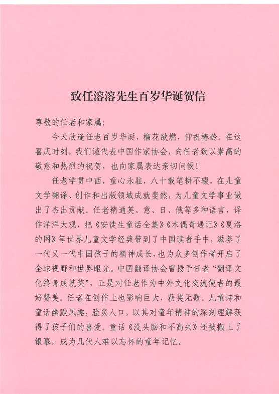 中國(guó)作協(xié)向任溶溶先生百歲華誕致賀信