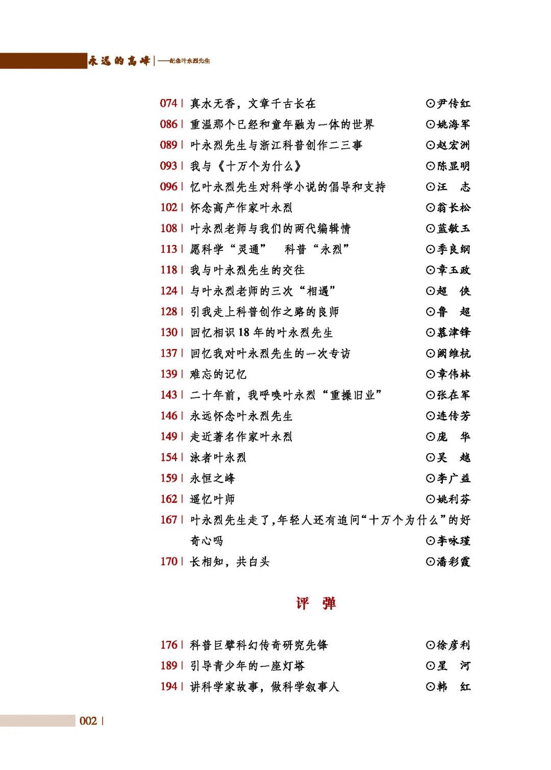 又是一年春夏之交,葉永烈先生離開我們已經(jīng)兩年了。2022年5月,葉永烈紀(jì)念文集《永遠(yuǎn)的高峰——紀(jì)念葉永烈先生》正式由四川人民出版社出版。文集從征文來稿和已發(fā)表的紀(jì)念文章中遴選了59篇進(jìn)行收錄,設(shè)有“追憶”“評彈”“致敬”“存檔·創(chuàng)作思想與實(shí)踐”等欄目。希望這本追憶葉先生生平與創(chuàng)作、評點(diǎn)其作品、繼承其創(chuàng)作思想的文集,能夠?qū)⑷~先生身為作家的人格魅力及創(chuàng)作思想精髓,傳遞給一代又一代科普科幻作家與讀者。