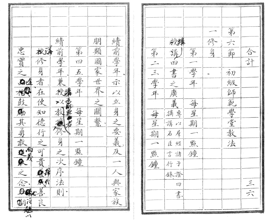 1904年初,癸卯學(xué)制對(duì)修身的目的及教法有更細(xì)致的規(guī)定。初等小學(xué)堂摘講朱子《小學(xué)》、劉宗周《人譜》及各種養(yǎng)蒙圖說(shuō),讀有益風(fēng)化之古詩(shī)歌,為兒童立“愛(ài)國(guó)家之根基”[10]。在師資稀缺的地區(qū),另立“簡(jiǎn)易科”,將修身課與讀經(jīng)課合而為一,于講經(jīng)時(shí)帶講修身?!蹲喽ǔ醯刃W(xué)堂章程》對(duì)修身科的設(shè)想,有三點(diǎn)值得注意:一是把明儒劉宗周的《人譜》作為修身教科書(shū)[11],二是以諷誦古詩(shī)歌作為幼童涵養(yǎng)性情之道[12],三是修身與讀經(jīng)在鄉(xiāng)野之地可合并講授。高等小學(xué)堂的修身科,每星期2鐘點(diǎn),講授“四書(shū)”要義,“以朱注為主,以切于身心日用為用”;共四學(xué)年,每年修身科的課程內(nèi)容相同,而讀經(jīng)講經(jīng)科則有程度之遞進(jìn),從《詩(shī)》《書(shū)》到更艱深的《易經(jīng)》及《儀禮》節(jié)本,每周課時(shí)是修身科的6倍。[13]