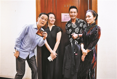 北京人藝68周年院慶劇場朗讀直播彩排后臺,馮遠(yuǎn)征、盧芳、吳剛、張培“表演”合影