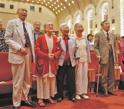 人藝建院60周年紀(jì)念會上的老藝術(shù)家們,左起朱旭、朱琳、胡宗溫、蘇民夫婦(攝于2012年6月12日)