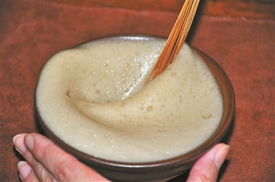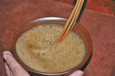 第三步:繼續(xù)續(xù)水,繼續(xù)攪拌,泡沫越來(lái)越厚,茶湯越來(lái)越白