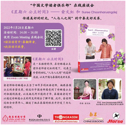 2022年6月11日,泰國“中國文學(xué)讀者俱樂部”成功舉辦《星期六公主時間》在線座談會。這是泰國俱樂部成立以來舉辦的第二場活動。曾擔(dān)任泰國公主詩琳通中文老師的中國作家俞文虹、《星期六公主時間》泰語譯者蘇麗(Suree Choonharuangdej)、南美有限公司總經(jīng)理陳美琪以及中國文學(xué)愛好者等共計40多人參加了此次活動。