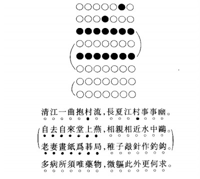 所謂“二字貫串”與“三字棟梁”,《木天禁語(yǔ)》并沒(méi)有給出解說(shuō)。按圖所標(biāo)為兩“村”字,應(yīng)該有誤。一般理解當(dāng)為“江”“村”二字?!叭謼澚骸保疵魅肆簶颉侗ㄔ?shī)式》(卷七)的說(shuō)法,是“妻”“紙”“棋”,顯然沒(méi)有意義。參考有關(guān)詩(shī)例,分析這首詩(shī),可以認(rèn)為是“事事幽”三字。又古人“事”“物”字義往往互借,根據(jù)該詩(shī)中間兩聯(lián)內(nèi)容,“事事”可以理解為“事事物物”。《冰川詩(shī)式》對(duì)“二字貫串”的解釋是:“起聯(lián)立二字,中兩聯(lián)分應(yīng)之,或每聯(lián)各句應(yīng)之。結(jié)聯(lián)脫言,亦要含意?!边@個(gè)“應(yīng)”講的就是“貫串”,即血脈針線。借鑒古人之說(shuō),發(fā)揮我們的智慧,可以對(duì)這首詩(shī)作很好的品鑒。第一聯(lián)上下句分別點(diǎn)出“江”和“村”兩個(gè)關(guān)鍵字(也是扣題),“事事幽”三字再作分解,分成“事事(物物)”與“幽”。詩(shī)題《江村》,寫(xiě)“江”寫(xiě)“村”,寫(xiě)江上之事(物)、村中之事(物),要寫(xiě)的就是一個(gè)“幽”,“幽”是全詩(shī)結(jié)穴,一詩(shī)之神,反反復(fù)復(fù),橫說(shuō)豎說(shuō),就是要寫(xiě)足“幽”。寫(xiě)好“幽”,詩(shī)便成功??粗虚g兩聯(lián),都是上句“村”下句“江”。假如換一個(gè)視角,用“事”和“物”兩字看,則是頷聯(lián)寫(xiě)“物”頸聯(lián)寫(xiě)“事”。如此就十分清楚:“自去自來(lái)堂上燕”,村中之物“幽”;“相親相近水中鷗”,江上之物“幽”?!袄掀蕻?huà)紙為棋局”,村中之事“幽”;“稚子敲針作釣鉤”,江上之事“幽”。結(jié)聯(lián)呢?《冰川詩(shī)式》說(shuō)“結(jié)聯(lián)脫言,亦要含意”,如何理解?結(jié)聯(lián)與“江”“村”“事”“物”都已無(wú)關(guān),從字面看,也無(wú)關(guān)乎“幽”,此即所謂“脫言”:擺脫開(kāi)來(lái),卻說(shuō)別意。那是不是與上文斷裂了?當(dāng)然不是,“亦要含意”就是要?dú)w到詩(shī)旨上來(lái)。就《江村》說(shuō),怎么“含意”?就是含“幽”之意。按首聯(lián)所言:我之所以“幽”,是由于“清江一曲抱村流”,居地江水環(huán)繞,與世隔絕。但這不可能是“幽”的真正原因。真正原因,是結(jié)聯(lián)的最后三字“更何求”,我已無(wú)求于世,人也無(wú)求于我。無(wú)欲無(wú)求,無(wú)思無(wú)為,身閑心靜,如此才“事事幽”。這才是“幽”的真正原因。結(jié)聯(lián)揭示詩(shī)旨,是全詩(shī)真精神所在。到此,我們不能不佩服千古經(jīng)典名作之詩(shī)藝高超。