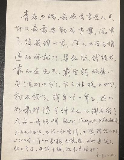 有件事大概知道的人不多,羅先生和周克希先生一樣,考大學時報的第一志愿是數(shù)學系,陰差陽錯被北大錄進西語系后才開始學的法文,所以他常感嘆自己的“藝文基礎差”,“下笨功夫”決不是什么自謙之辭。“我的睡眠是偉人型的,晚睡早起,從不瞌睡。如此勤勉,卻什么也沒干出來?!彼w慕梁啟超、陳寅恪、錢鍾書這等天才人物所擁有的常人不可企及的靈氣,說:“我輩忙一輩子,還不如肖邦隨手彈出的幾個音符!”(見右上手跡)所以,在這樣一個成就斐然卻總愛把自己貶到塵埃里的人面前,任誰不都得戰(zhàn)戰(zhàn)兢兢地掂一掂自己的分量么?有時我難免流露出沮喪之意,羅先生又反過頭來安慰道:“當然不應泄氣,還應盡最大可能,把自己的事做好。爭名逐利,不必,大多數(shù)人最后也沒有多少名多少利。還是安于淡泊,較為明了。但你年輕聰明,至少這十廿年里,要創(chuàng)造自己的輝煌?!?/p>