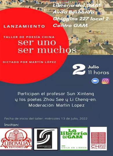 7月2日,由智利“中國文學讀者俱樂部”與米斯特拉爾文化中心書店、辛普雷門特出版社、書之地出版社共同主辦的“中國詩歌工作坊”首場活動,在智利首都圣地亞哥的“文化地標”米斯特拉爾文化中心書店舉行。智利前駐華大使、智中文協(xié)主席、智利“中國文學讀者俱樂部”負責人雷耶斯·馬塔、智利詩人馬丁·洛佩斯、辛普雷門特出版社社長莫妮卡等20余人現(xiàn)場參加。北京語言大學拉美研究中心主任孫新堂、中國詩人周瑟瑟和李成恩在線參加,100余人通過臉書(Facebook)和照片墻(Instagram)平臺在線參與觀摩和互動。