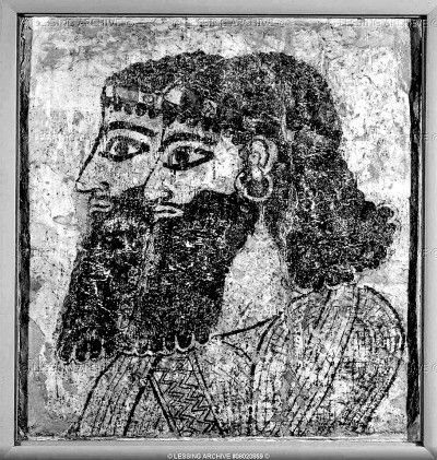 亞述是一個(gè)軍事帝國,為了渲染戰(zhàn)爭勝利,亞述人將美索不達(dá)米亞浮雕藝術(shù)發(fā)展到巔峰。亞述存世的藝術(shù)品多為表現(xiàn)戰(zhàn)爭及獵獅的浮雕,而壁畫很少,只有現(xiàn)今敘利亞境內(nèi)的泰爾·阿赫馬爾遺址殘留有約130米的壁畫,屬于提格拉特·帕拉沙爾三世(公元前744年—公元前727年在位)時(shí)期。此次敘利亞精品展便有其中一幅壁畫截圖,現(xiàn)收藏在敘利亞阿勒頗博物館。該壁畫截圖描繪的是兩位男子胸部以上半身像,用粗黑線條勾畫,人物濃眉大眼、頭系發(fā)帶、須發(fā)茂密,須發(fā)中隱約可見螺旋卷紋,具有與亞述浮雕藝術(shù)一致的風(fēng)格。