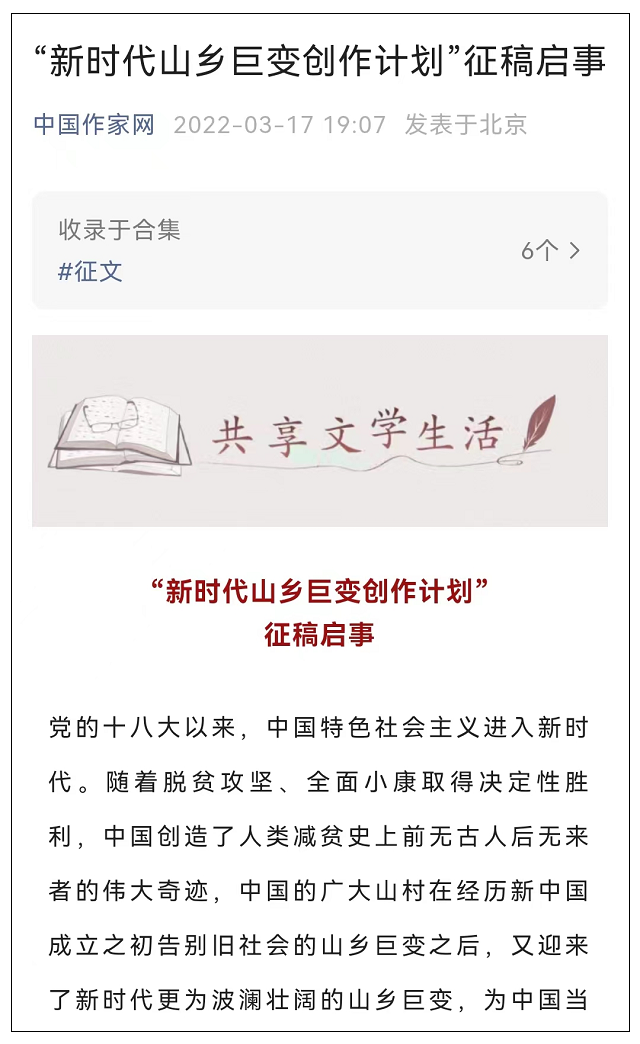 2022年3月17日,中國作家協會正式發(fā)布“新時代山鄉(xiāng)巨變創(chuàng)作計劃”征稿啟事。征稿啟事中寫到,“新時代山鄉(xiāng)巨變創(chuàng)作計劃”以原創(chuàng)長篇小說形式聚焦新時代中國山鄉(xiāng)天翻地覆的史詩性變革,多角度展現鄉(xiāng)村時代變遷,生動講述感天動地的山鄉(xiāng)故事,塑造有血有肉的人民典型,為人民捧出帶著晶瑩露珠、散發(fā)泥土芳香的新時代文學精品,以文學力量激發(fā)新時代鄉(xiāng)村振興的昂揚斗志與堅定信念。