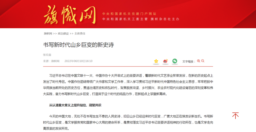《旗幟》雜志2022年第5期發(fā)表中國作家協會黨組書記、副主席張宏森文章《書寫新時代山鄉(xiāng)巨變的新史詩》。張宏森說,習近平總書記在中國文聯十一大、中國作協十大開幕式上的重要講話,著眼新時代文藝事業(yè)繁榮發(fā)展,在新的歷史起點上發(fā)出了時代號召。中國作協團結帶領廣大作家和文學工作者,深入學習貫徹習近平新時代中國特色社會主義思想,牢牢把握中華民族當前所處的歷史方位,貫通壯闊歷史和恢弘時代,聚焦脫貧攻堅、鄉(xiāng)村振興、農業(yè)農村現代化建設背后的深刻變革和偉大實踐,奮力書寫新時代山鄉(xiāng)巨變,打造屬于這個時代的精品力作,在新起點上攀登新高峰。