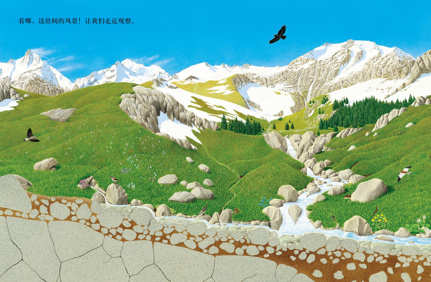 大山、池塘、河流、入??凇恳活惖孛捕甲猿梢粋€完備且獨特的小世界?!蹲匀粓D鑒》中,作者以細(xì)膩筆觸繪制了數(shù)百種動植物,表現(xiàn)出山地、池塘、河流和入海口四種地貌中錯綜復(fù)雜又相互聯(lián)系的動植物生態(tài)系統(tǒng),呈現(xiàn)了開放多樣的野性世界。山地景觀壯麗,但隨著海拔升高,氣溫降低,地面越發(fā)崎嶇,生存條件越發(fā)艱苦。即便如此,山中各處仍有一些植物和動物能夠存活。池塘和沼澤的生物多樣性令人驚嘆,動植物幾乎能涵蓋全部生物的門類,沼澤雖充滿危險,但同樣生機(jī)勃勃。隨著水波的持續(xù)奔涌,河流兩岸的風(fēng)景也在不停變幻,水生植物和魚類在河流中扎根、繁殖,鳥兒和哺乳動物則在水域附近的生態(tài)中棲身。百川歸海,河川注入海洋的地方是入???,海灘同樣是蠕蟲、軟體動物和甲殼動物以及被它們所吸引的魚類和鳥類生活的家園,構(gòu)成了豐富多彩的生命世界。