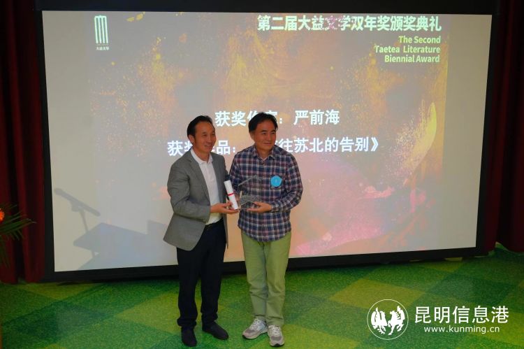嚴(yán)前海(右)獲得第二屆“大益文學(xué)雙年獎(jiǎng)”