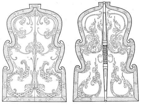《周禮·夏官》說周到有“五兵五盾”,具體是哪五種盾則不太清楚。除了車盾、步盾外,應(yīng)該還有一種專門用來樂舞的舞盾。兩周之際出現(xiàn)了一種新的盾牌形制,兩側(cè)呈弧形,更加貼近人體生理特征,也就是戰(zhàn)國秦漢最為流行的“雙弧盾”?!半p弧盾”不少繪制有精美的漆繪,如湖南長沙五里牌戰(zhàn)國楚墓中,就出土了兩面非常精美的皮制漆盾,表面用赭石和藤黃雙色繪制出龍鳳花紋。這些盾牌都不會(huì)是作戰(zhàn)使用,而只在貴族宴會(huì)上供舞者使用。