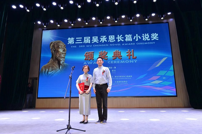 吳承恩長篇小說獎組委會主任、中國作協(xié)黨組成員、書記處書記、《人民文學》主編施戰(zhàn)軍為獲獎作品《你好,安娜》作者蔣韻頒獎