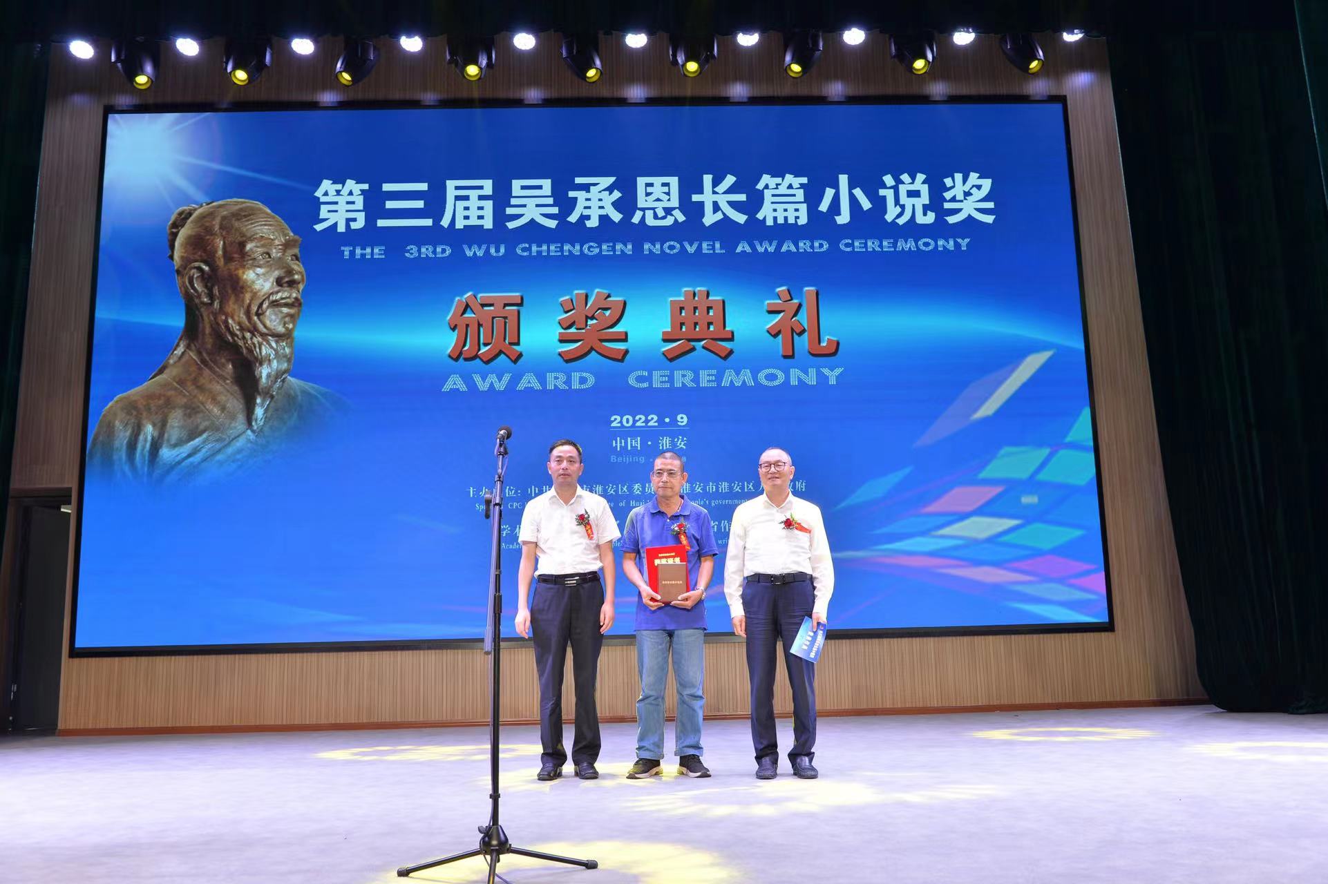 9月11日,備受社會各界關(guān)注和文壇矚目的第三屆吳承恩長篇小說獎頒獎典禮在江蘇省淮安市淮安區(qū)舉行。共有7部長篇小說獲獎,分別是鄧一光的《人,或所有的士兵》、蔣韻的《你好,安娜》、王晉康的《宇宙晶卵》、胡學文的《有生》、張平的《生死守護》等5部全國性獲獎作品,以及2部淮安籍本土作品,即于兆文的《大胡莊?1941》和魏嘉陵的《特別黨產(chǎn)》。