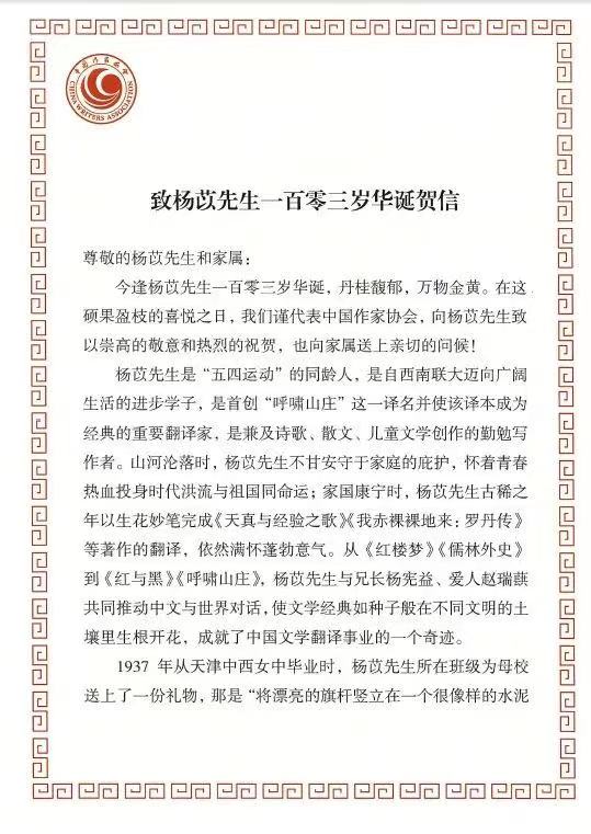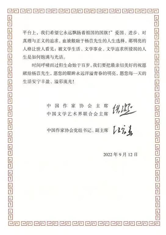 2022年9月12日,是我國著名翻譯家、作家楊苡先生的103歲華誕。中國作協(xié)主席、中國文聯(lián)主席鐵凝和中國作協(xié)黨組書記、副主席張宏森親筆簽名致信,向她致以崇高的敬意和熱烈的祝賀,并向其家屬送上親切的問候。