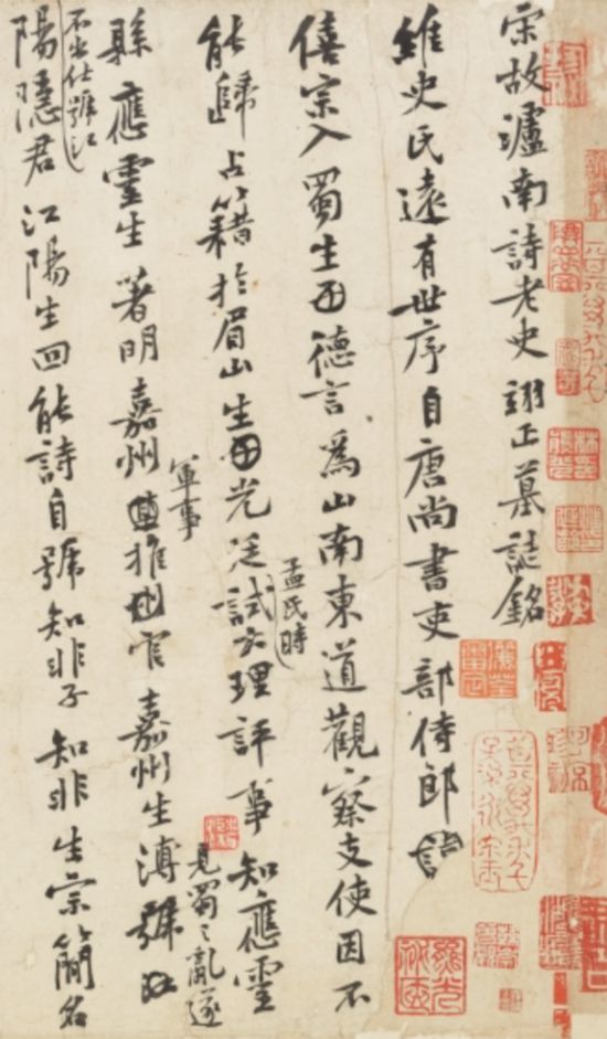 而《宋盧南詩老史翊正墓志銘稿》,凡二十一行,另補寫五行,行二十字左右。全稿文字涂改約二十處,亦非定稿本。“瀘南詩老”史扶,字翊正。史氏家族自唐僖宗年間入蜀,占籍于眉山。史氏少時篤學能詩,然屢試科舉不第,后游瀘州,閉門讀書并教授弟子,士人推與之曰“詩老”。紹圣三年(1096)四月卒于瀘州,葬于元符二年(1099)正月。時黃庭堅貶官戎州(今四川宜賓),史扶嫡次子史鎮(zhèn)遂請為撰墓志銘。此墓志銘稿無署款及年月,因其中有"葬以元符二年正月癸亥",徐邦達先生《古書畫過眼要錄》定此墓志銘為元符二年所作,時山谷五十五歲。