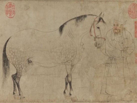 《五馬圖》畫卷分五段,前四段均有北宋書法家黃庭堅的題簽,卷尾有黃氏跋語,另有南宋初的曾紆跋,言及黃庭堅題于元祐五年(1090年)。此卷南宋時歸內府收藏,入元、明,經(jīng)柯九思、張霆發(fā)諸家遞藏,康熙年間藏河南商丘宋犖家,乾隆時入清宮乾隆皇帝兩次在《五馬圖》圖上題文,著錄于《石渠寶笈重編》。
