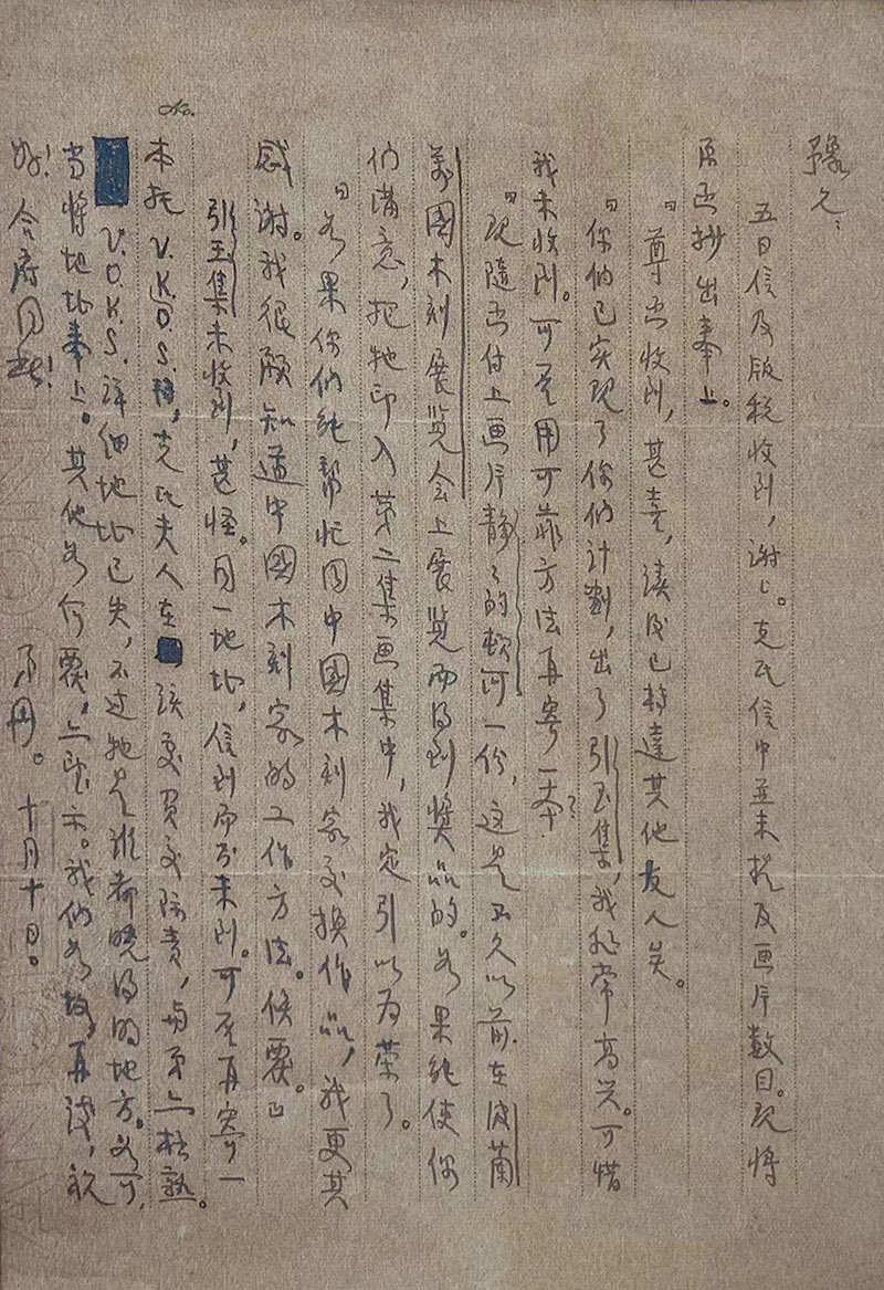 翻譯家、散文家、教育家曹靖華致魯迅信,寫于1934年10月10日。1927年起曹靖華在蘇聯(lián)任教,從1930年年初到1933年秋回國,四年中為魯迅搜集了蘇聯(lián)木刻家的木刻原拓一百余幅,魯迅把這些作品編成《引玉集》和《拈花集》。當(dāng)時(shí)魯迅需要蘇聯(lián)木刻家的生平,曹靖華為之一一聯(lián)系,并由曹靖華翻譯后寄給魯迅?!兑窦酚?934年出版,此信所涉及的是《引玉集》出版后,魯迅將此書寄給蘇聯(lián)木刻家,加強(qiáng)中蘇木刻藝術(shù)交流,曹靖華為之進(jìn)行翻譯和聯(lián)系的事。其中“克氏”指蘇聯(lián)木刻家克拉甫兼珂,“V.O.K.S.”是“蘇聯(lián)對(duì)外文化協(xié)會(huì)”的英文縮寫。