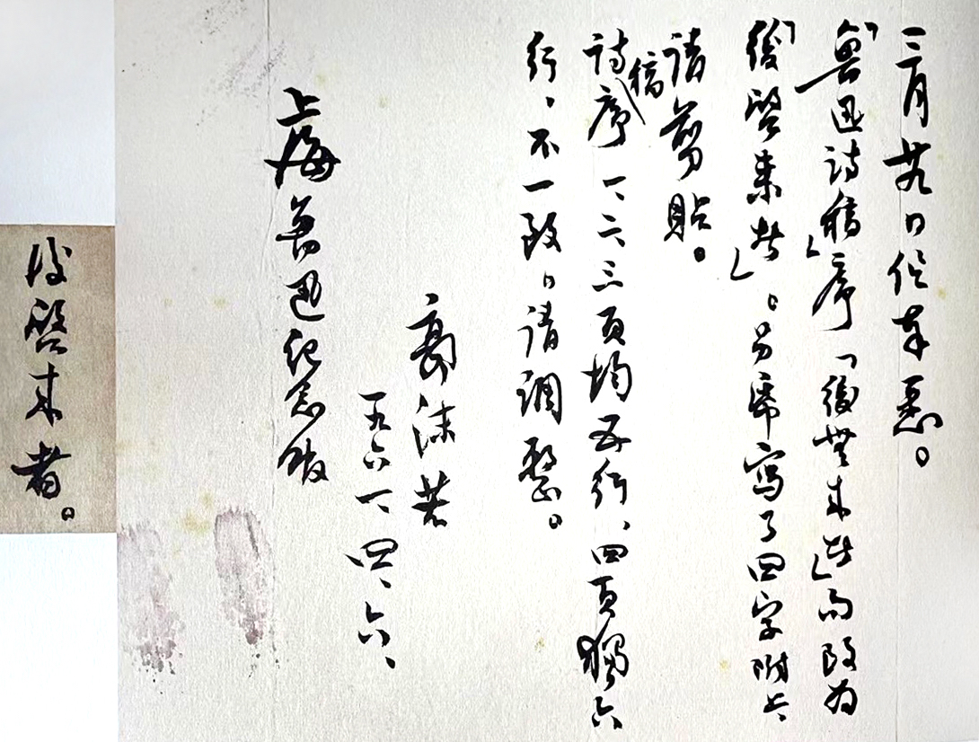 而文博大家鄭振鐸致施崇翔信件所關(guān)注的也是《魯迅全集》事宜。信中所寫:“即將“全集”掃數(shù)交還許先生發(fā)售……”。展覽中,另一件郭沫若的信寫于1961年,為郭沫若致上海魯迅紀(jì)念館,關(guān)于為上海魯迅紀(jì)念館編《魯迅詩稿》作序之事。