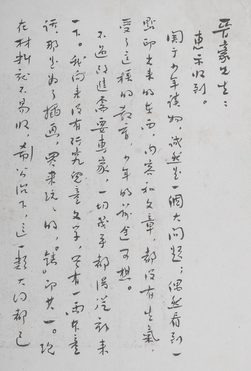 此外,展廳中也有魯迅本人的書信。其中,魯迅致楊晉豪信,寫于1936年3月11日。1936年楊晉豪任北新書局《小學(xué)生》半月刊編輯,楊晉豪致信魯迅,向魯迅約稿。魯迅于1936年3月11日復(fù)函楊晉豪,信中對(duì)于目前的少年讀物現(xiàn)狀表示擔(dān)心,并坦誠地說“我向來沒有研究兒童文學(xué)”,“相識(shí)的人里面,也沒有留心此道的人”,“曾有的一兩本童話,那是為了插畫,買來玩玩的”,“所以真是無能為力”,婉言謝絕楊晉豪的約稿。這體現(xiàn)了魯迅一貫的風(fēng)格:自己沒有深入的了解,就不能誤人子弟。但他建議:“不過改進(jìn)需要專家,一切幾乎都要得從新來一下?!?顯示了魯迅對(duì)中國兒童文學(xué)建設(shè)的關(guān)心和重視。