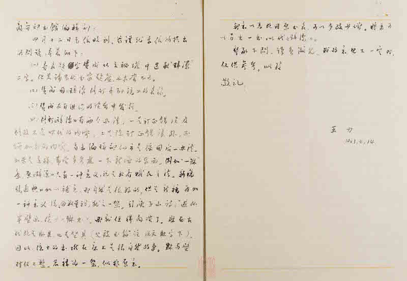 另一個(gè)小板塊是“《辭源》修訂”?!掇o源》是一部古漢語專門工具書,始編于1908年,續(xù)編于1931年。原有自然科學(xué)、社會(huì)科學(xué)和應(yīng)用技術(shù)相關(guān)條目,有一定百科全書性質(zhì),第二版后刪去,成為專門語文工具書,1915年由商務(wù)印書館初版。新中國成立以后,1958年,《辭源》修訂工作開始。由于與《現(xiàn)代漢語詞典》《辭?!返姆止?,《辭源》由綜合性百科辭書,修訂為一部大型的古漢語辭書。商務(wù)印書館設(shè)置了“辭源組”,1964年,《辭源》修訂稿第一冊(cè)出版。在這一展柜,呈現(xiàn)了王力、陳夢(mèng)家等人致商務(wù)印書館編輯部的信,探討《辭源》修訂相關(guān)問題。