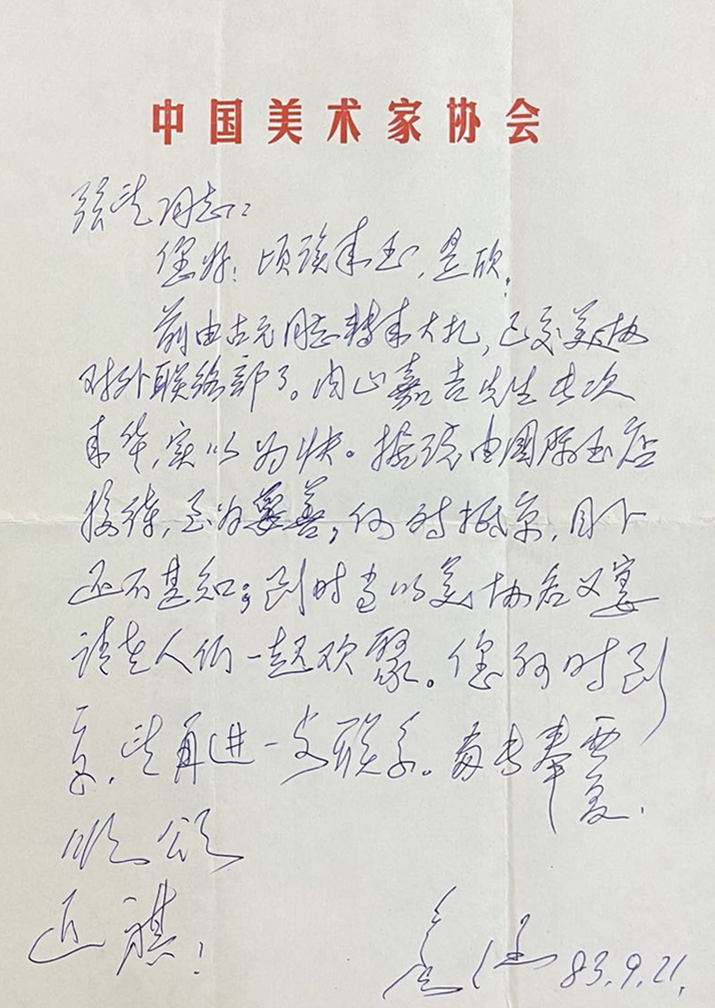 彥涵致張望信,寫于1983年9月21日。因?yàn)閮?nèi)山嘉吉要來中國,張望請(qǐng)古元轉(zhuǎn)交信札給彥涵,告知相關(guān)事宜。此信是彥涵對(duì)張望來信的回復(fù),并表示到時(shí)當(dāng)以美協(xié)名義請(qǐng)老一輩的木刻家們一起歡聚。