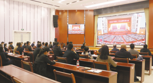 黃河出版?zhèn)髅郊瘓F(tuán)組織黨員干部、職工收看黨的二十大開幕會。 黃河出版?zhèn)髅郊瘓F(tuán) 供圖