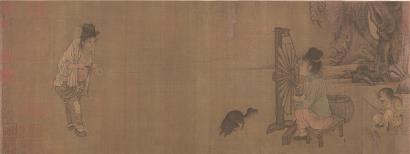 北宋王居正繪《紡車圖》表現(xiàn)農(nóng)家勞作紡紗的情形。圖繪一位老嫗弓腰駝背,站立紡線,通過兩條線與之連接的是畫面另一側(cè)的紡車,車右側(cè)有一女子一邊要紡車一邊懷抱嬰孩哺乳,其身后有一幼兒在戲蟾,還有一只黑狗在回首狂吠
