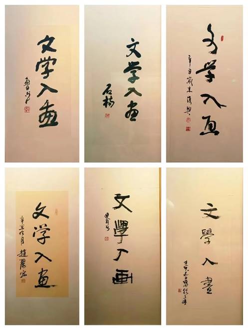 此次展覽沒有開幕式,也沒有閉幕式,展出六人作品60件,每位作者都書寫了“文學(xué)入畫”四個字,體現(xiàn)了展覽的特色。