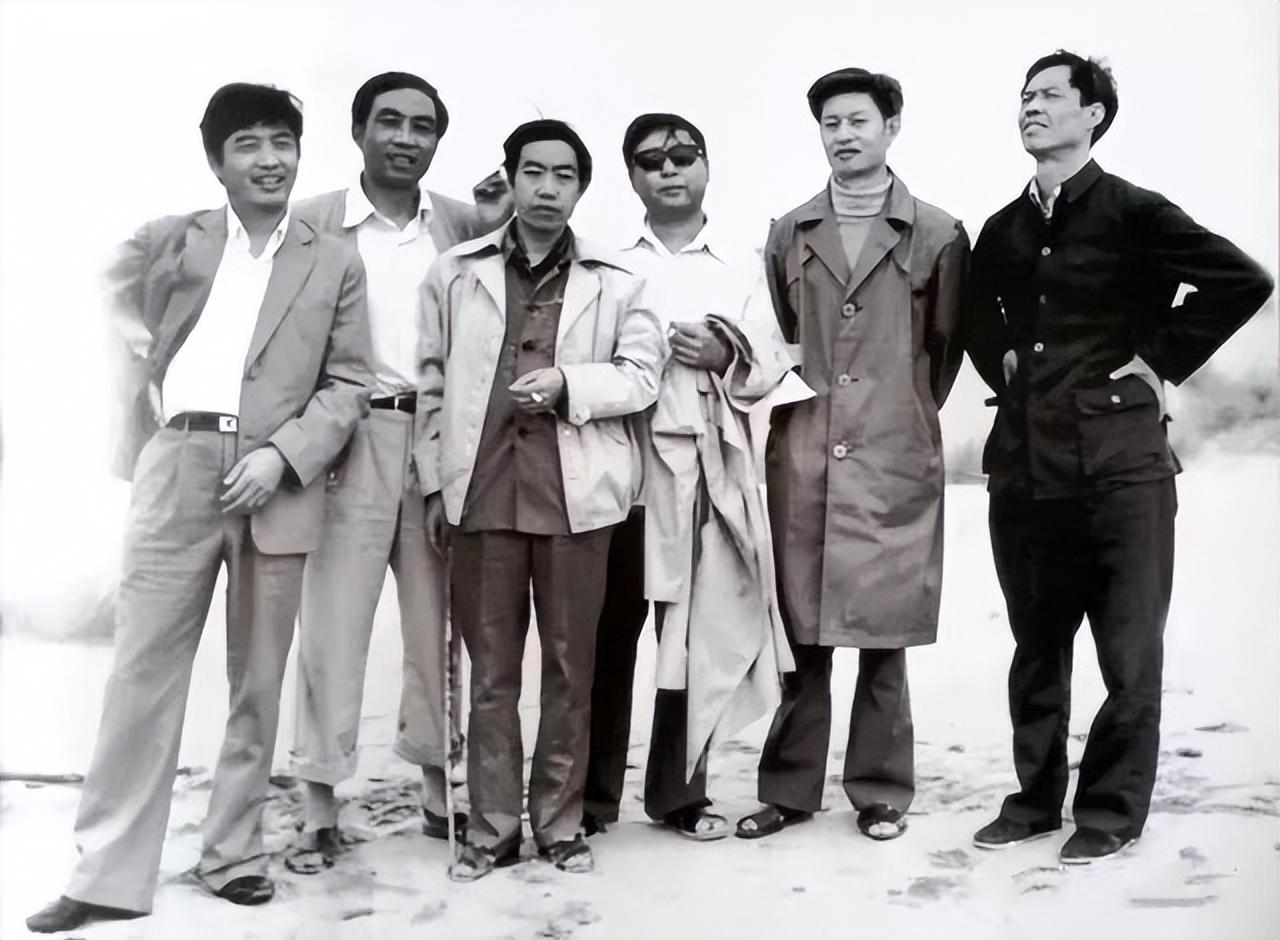 1985年秋攝于陜北毛烏素沙漠 (左起依次)子頁、白描、賈平凹 路遙、京夫、陳忠實(shí)