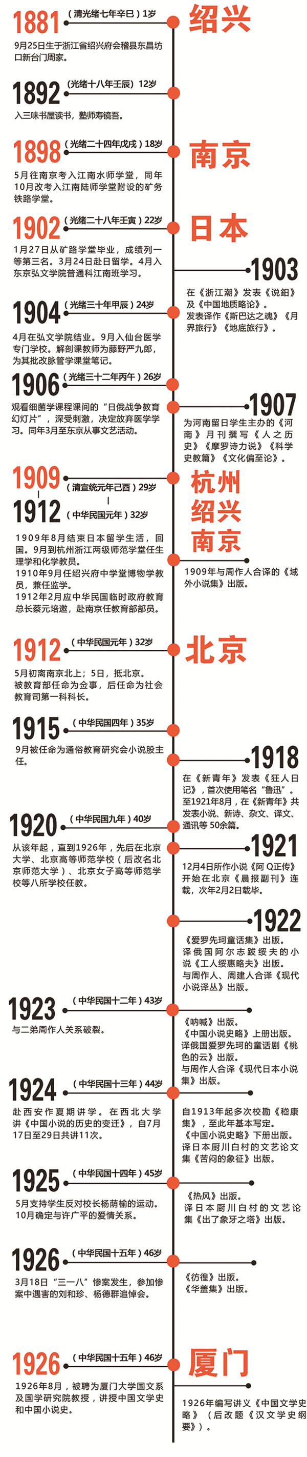 1898年,魯迅懷著“走異路,逃異地,去尋求別樣的人們”的想法,告別家鄉(xiāng),出門遠行,在南京學習4年后,獲得官費留學的資格,赴日本留學。學成歸國之后,魯迅又應蔡元培之邀,在南京的民國教育部任職。在南京、日本時期,是周樹人成長為魯迅的關鍵時期,是文學家、思想家、革命家魯迅的前傳。