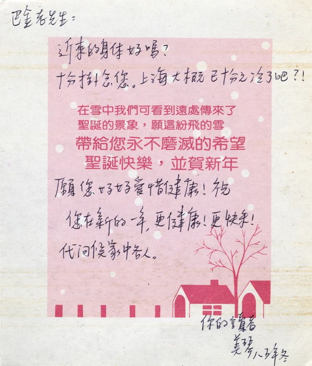 巴老在他的全集“代跋”中曾哀傷地說:“三十年代、四十年代的青年把我當(dāng)作他們的朋友……五十年代到八十年代的青年不再理解我了……因為我老了,我的書也老了……”事實顯然并非如此,伍美琴的信、賀卡、文章還有急于拜訪巴老的心情就是另外例子中的一個。