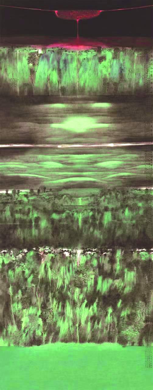 隨著時代的變化,生活空間在擴展,表現(xiàn)領域也在拓寬,如何以更具創(chuàng)造性的筆墨語言傳遞創(chuàng)作者的所思所感所想?就我個人的經歷感受來說,我生活的那樣一個特殊的地理、地域、環(huán)境,基于對東北大地自然物象的觀察、對家鄉(xiāng)的深厚情感,以及對傳統(tǒng)山水畫的深入研究,我開始嘗試超越對具體自然景象的描摹,以線的勾勒和大面積的皴擦、渲染,構成新的語言符號和圖式,創(chuàng)作出“靜觀作八荒”系列山水畫。這些作品旨在通過富有象征意義的宏觀景象,彰顯崇高、神圣、寧靜的東方意境。此后,我也不斷從傳統(tǒng)與自然之中汲取創(chuàng)作養(yǎng)分,也在這本大書中去尋找靈感,陸續(xù)創(chuàng)作了“唐人詩意”“山海經”等系列作品,借助古代詩文當中的浪漫想象,營造理想山水家園,詮釋對于宇宙天地的宏觀思考和對于詩意棲居的微觀洞察。