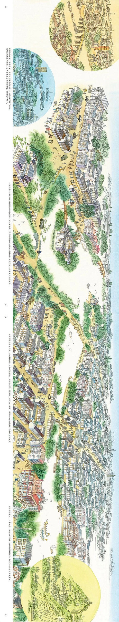 《一個人,一座城》的繪畫獨具匠心,承擔了十分重要的敘事功能。畫面以俯瞰視角構(gòu)圖取景,用恢弘細致的畫卷生動記錄了一座城的變化和這座城里人們的生活細節(jié)。視野開闊、場景宏大的畫面中繪制了人物、動物、車輛、船只、房屋、橋梁、城樓等細節(jié)。這些細節(jié)大至田野、河流,小到房屋里的人物、攤販陳設(shè)的貨物,商鋪招牌上的文字……嚴密緊湊,一氣呵成,不僅生動刻畫了張謇不平凡的人生,更描繪出了不同歷史和時代的風貌,展現(xiàn)了南通城的發(fā)展與變遷。