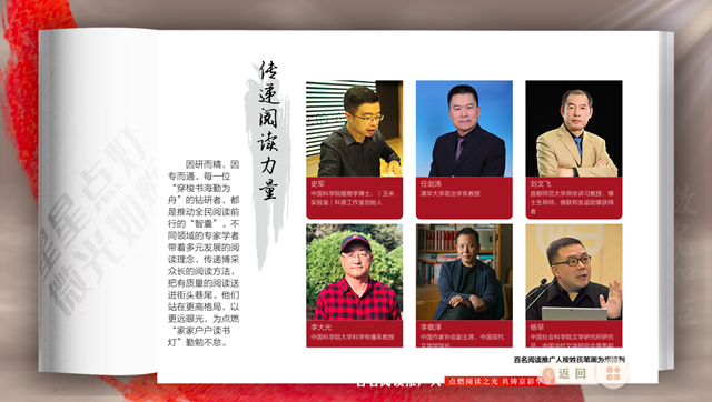 作為北京市公共圖書館的中心館和龍頭館,首都圖書館攜手全市公共圖書館打造本展覽,設(shè)置“弘揚閱讀文化”“播撒閱讀種子”“傳遞閱讀力量”“奏響閱讀強音”四大版塊,通過視頻講述、文字概述、照片展示,全要素呈現(xiàn)了來自圖書館員、民間閱讀推廣人、專家學(xué)者、媒體人等各行各業(yè)的100位優(yōu)秀閱讀推廣人的精彩故事。展現(xiàn)北京全民閱讀事業(yè)的鮮活成就,及對京津冀公共文化協(xié)同發(fā)展乃至全國范圍閱讀推廣的輻射力。