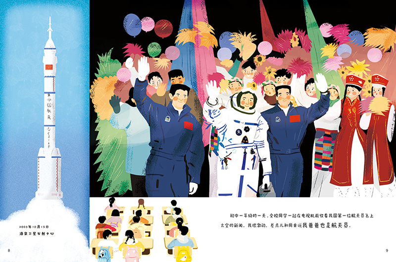 中國作家網(wǎng):看完您創(chuàng)作的“爸爸系列”繪本,我十分感動,尤其是《爸爸的秘密》以一個女兒的視角,從好奇到期待、再到淡淡的失落,講述了父親鄧清明25年來對航天事業(yè)的執(zhí)著、堅(jiān)守與努力。是什么契機(jī)促使您關(guān)注到航天題材,并且選取這個感人的角度,能否回憶一下當(dāng)時的創(chuàng)作歷程?這對父女之間的故事,哪一個瞬間讓您最為感動和難忘?