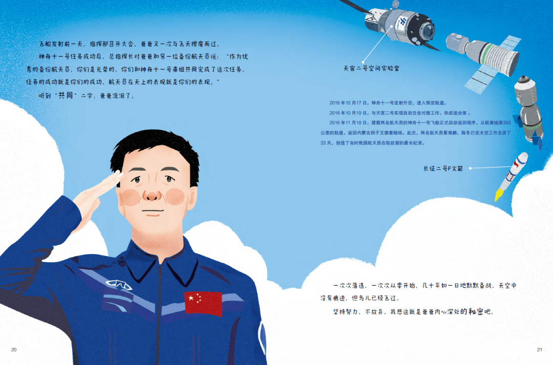 趙墨染:2016年我在清華美院讀書的時候選擇做科普繪本的研究,有了一些科普繪本的創(chuàng)作經(jīng)驗(yàn)。2018年中國少年兒童新聞出版總社的唐威麗老師聯(lián)系到我說有這樣一個航天員的故事,問我感不感興趣。本身我對航天題材也很感興趣,看了鄧清明父女《朗讀者》的節(jié)目后,被深深地打動了。之后在出版社的安排下我和鄧清明的女兒滿琪見面了,自此開始了我們?nèi)甑膭?chuàng)作之旅。這三年我們線上線下溝通了多次,她給我提供了非常詳盡的資料。比如故事的腳本,相關(guān)的影像資料,參考書籍、電影和紀(jì)錄片等等。從文字到分鏡圖再到正稿,滿琪很認(rèn)真地校對每一處。因?yàn)樗鳛楹教烊说膶I(yè)背景,有她在我會很踏實(shí)。說到印象最深的瞬間是神舟十一號任務(wù)準(zhǔn)備階段,滿琪在指揮大廳值班看到爸爸出現(xiàn)在大屏上,她眼含淚水的樣子讓我難忘。