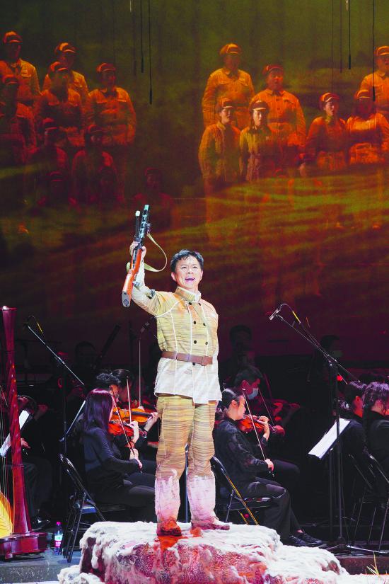 當(dāng)然,一部?jī)?yōu)秀的舞臺(tái)作品離不開(kāi)藝術(shù)家的二度創(chuàng)作。男高音歌唱家王宏偉從軍30余年,有不少家喻戶曉的代表作,塑造過(guò)一個(gè)個(gè)生動(dòng)鮮活的人物形象。黃繼光在他的演繹之下亦別具魅力。從音樂(lè)表現(xiàn)來(lái)看,王宏偉以清亮高亢的嗓音將人物的唱段詮釋得淋漓盡致。《抬頭仰望夜黑的天》是黃繼光與戰(zhàn)友失散后于山林間的一段內(nèi)心獨(dú)白,抬頭仰望夜空,他想起家中年邁的母親,想起祖國(guó)親人的囑托,情緒從茫茫無(wú)依到想起歸宿,風(fēng)格從極致浪漫到堅(jiān)定激昂,王宏偉通過(guò)這段演唱將人物內(nèi)心情緒的轉(zhuǎn)變?cè)忈尩昧Ⅲw飽滿。戰(zhàn)斗打響之前,黃繼光一段《等我把立功喜報(bào)寄回家》的演唱,纏綿中帶著激昂,慷慨中繞著思念,將親情、戰(zhàn)友情和思念祖國(guó)的鄉(xiāng)情三位一體地展現(xiàn)了出來(lái)。