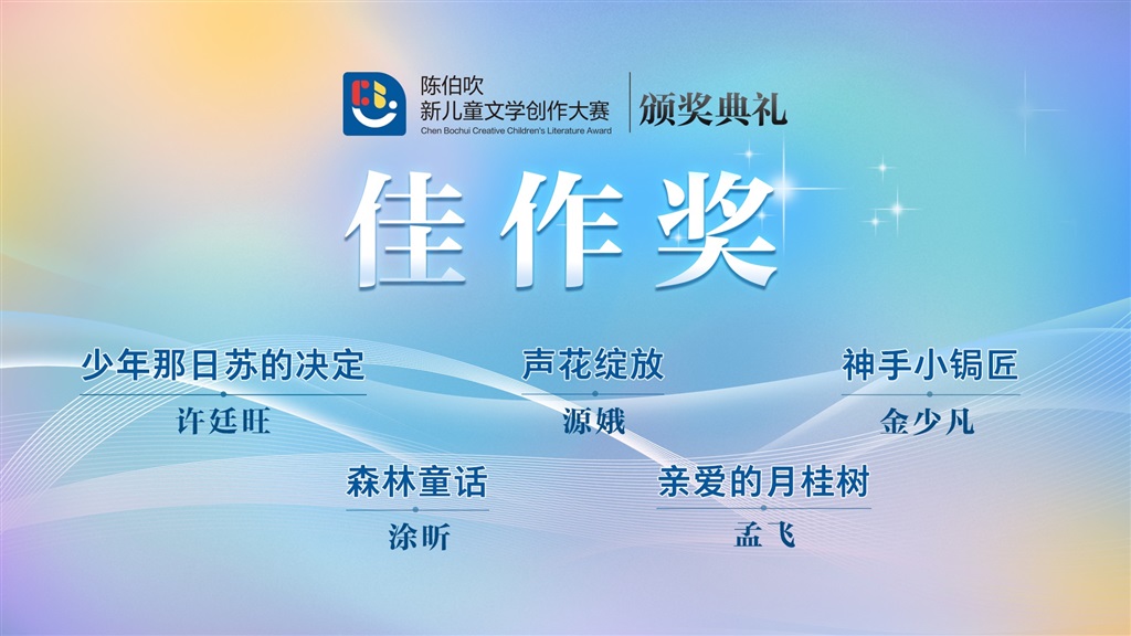 12月16日,首屆陳伯吹新兒童文學創(chuàng)作大賽頒獎典禮暨上海譯文童書中心成立五周年紀念活動在世紀出版園舉行。《少年那日蘇的決定》《聲花綻放》《神手小鋦匠》《森林童話》《親愛的月桂樹》獲得“陳伯吹新兒童文學創(chuàng)作大賽佳作獎”,《會跳舞的狼》《你是水晶、冬天、葡萄和鳥》《飛上云端的足球》獲得“陳伯吹新兒童文學創(chuàng)作大賽桂冠獎”。