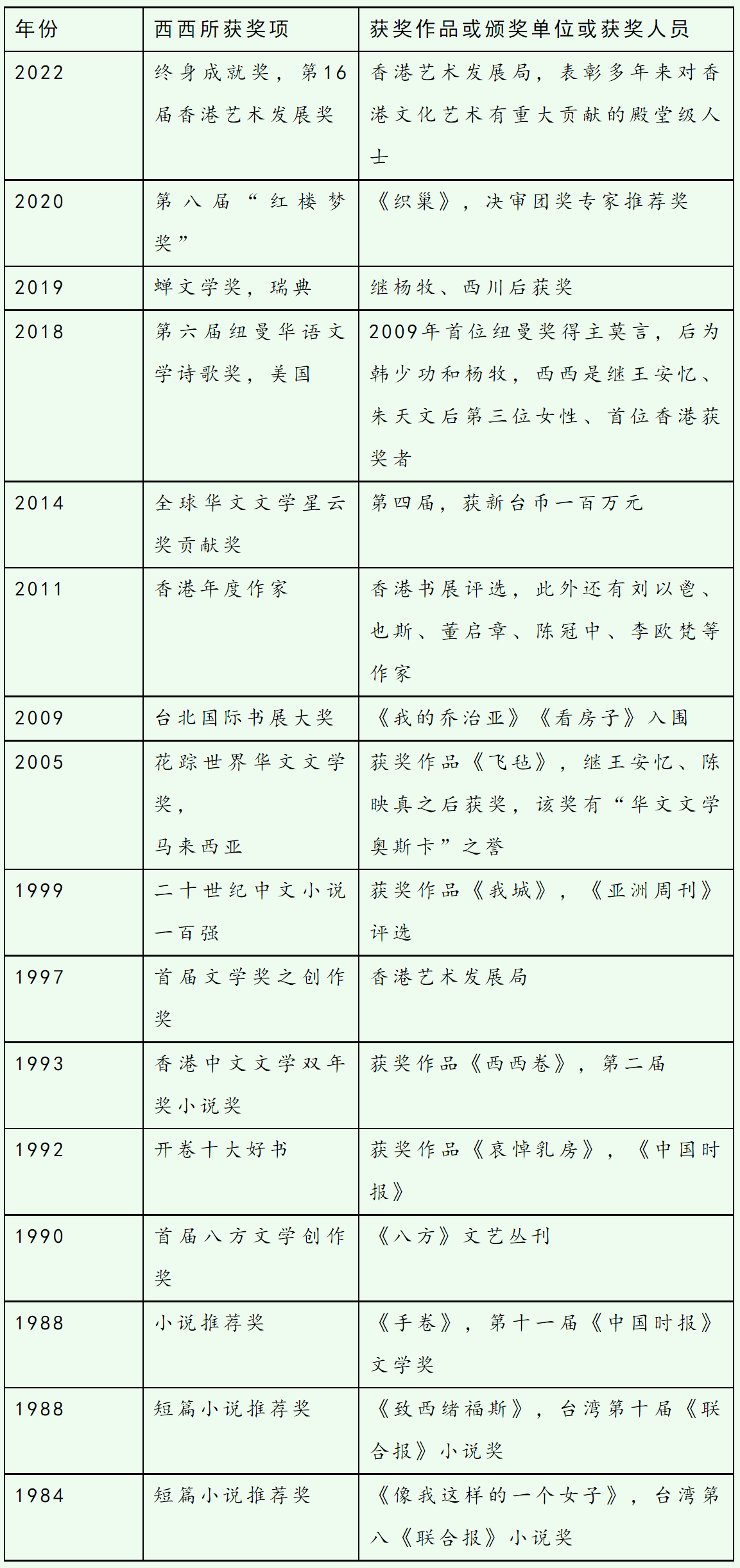 2005年獲《星洲日報》“花蹤世界華文文學(xué)獎”,2011年獲香港書展“年度作家”,2018年獲美國“紐曼華語文學(xué)獎”。2019年獲瑞典“蟬文學(xué)獎”。2022年5月23日,西西獲第十六屆香港藝術(shù)發(fā)展獎之“終身成就獎”。作家莫言曾評價西西:“她盡管是一個弱女子,但她在作品中所表現(xiàn)出的對生活的熱情,她對困難的不屈不撓的斗爭精神,也是體現(xiàn)了一種超越了她個人的大的氣象,是一個弱女子寫出來的大文學(xué)?!?/p>