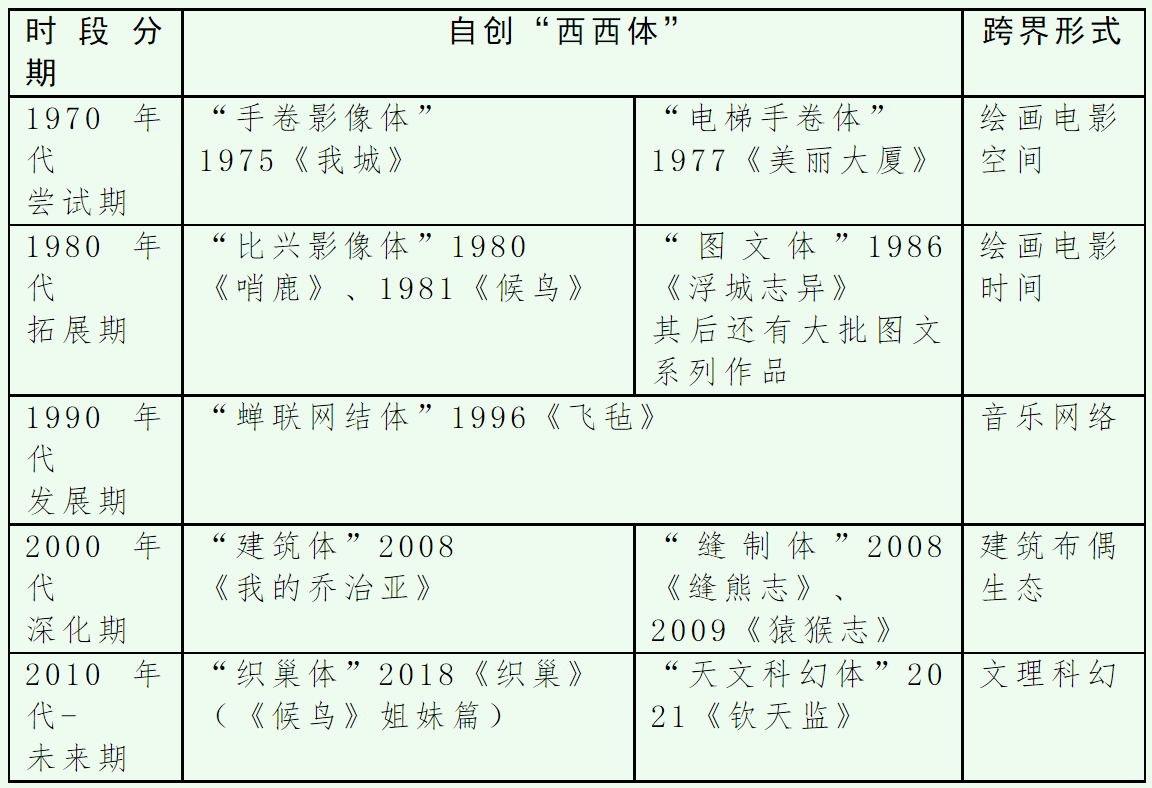筆者自2003年起寫博士論文《跨藝術(shù)、跨文化的創(chuàng)作視野——論西西小說的文體創(chuàng)新》,2009年出版為《跨媒介敘事——論西西小說新生態(tài)》[4],堅信西西價值在于獨(dú)創(chuàng)“跨媒介敘事”,在文學(xué)與電影、繪畫、音樂、戲劇等藝術(shù)之間找到融合之道,其意義有三:一是開創(chuàng)跨媒介敘事多元新形態(tài),如影像敘事小說、圖文敘事小說、蟬聯(lián)想象曲式;二是呈現(xiàn)中國漢語敘事的本土性;三是構(gòu)建女性主義文學(xué)的新美學(xué)。近20年過去,筆者依然認(rèn)定,西西是融界大師,多才多藝創(chuàng)意盎然,一個人就撐起跨界創(chuàng)意的文藝王國,拓展跨媒介文藝的新紀(jì)元,在不同歷史時期,雕刻出各種“西西體”系列: